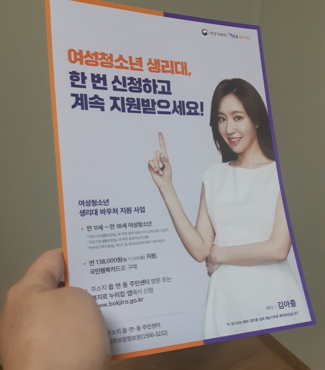 몇 년 전에 생리대 살 돈이 없어 신발 깔창이나 휴지로 버티는 소녀들이 있다는 신문 기사를 읽은 적이 있다. 신발 깔창이라는 말에 정말 깜짝 놀랐었는데, 다행히 그 후 여성청소년들의 생리대 구매비용을 지원해 주는 제도가 신설되었다고 하니 필요한 가정에서 꼭 신청하면 좋을 것 같다.