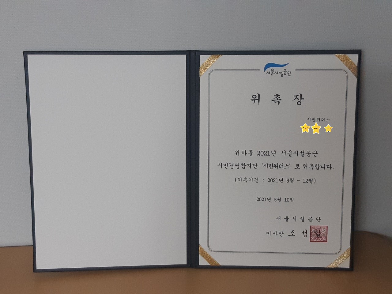 지난 4월에 서울시설공단이 모집하는 시민경영참여단 ‘시민위더스’에 지원서를 제출했던 적이 있다. 그 후 블로그에 소식을 전하지는 않았었지만, 기쁘게도 합격 문자를 받고 5월 10일부터 활동을 시작했었는데, 드디어 지난 수요일에 위촉장을 받게 되었다. 예전에는 시민위더스 전체 모임을 갖고 위촉장을 받았었다고 하는데, 코로나19 때문에 등기우편으로 위촉장을 전달받게 된 것이다.
