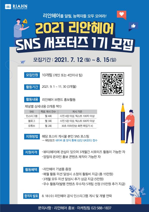 ‘리안헤어’(RIAHN)에서 ‘SNS 서포터즈 1기’를 모집한다. 이번 리안헤어 SNS 서포터즈는 인스타그램, 블로그, 유튜브 분야에서 총 10개 팀을 모집하게 되며, 개인뿐 아니라 4인 이내 팀으로도 도전할 수 있다.