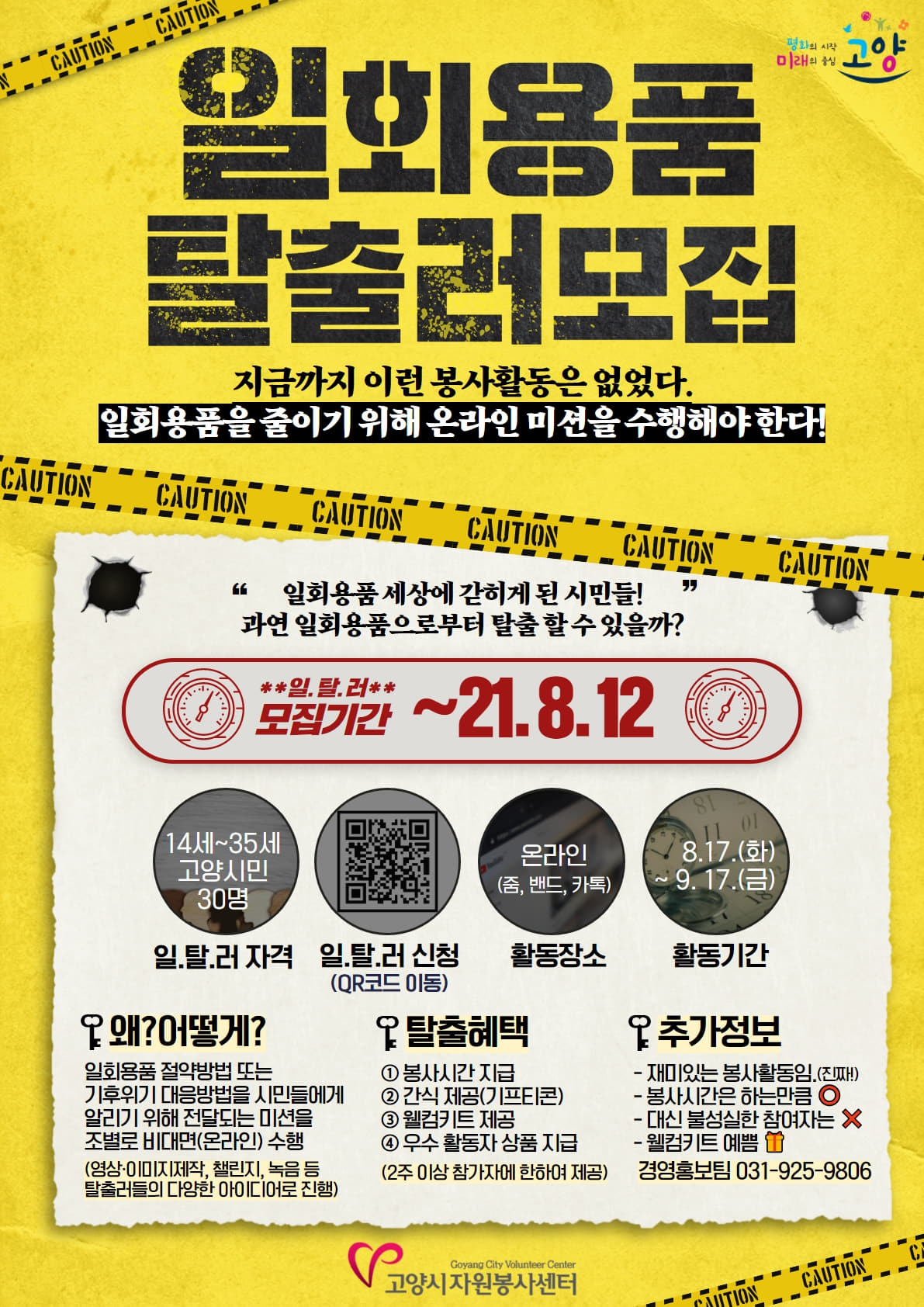 이번에 모집하는 ‘일회용품 탈출러’는 14세부터 35세까지의 고양시민을 대상으로 한다. 모집 기간은 2021년 8월 12일(목)까지이며, 선착순 접수가 아니라 질문지 작성 내용에 따라 총 30명을 선발한다. 2021년 8월 17일(화)부터 9월 17일(금)까지 한 달 동안 일회용품 절약방법 또는 기후위기 대응방법을 시민들에게 알리는 미션을 조별로 수행하게 되며, 영상, 이미지 제작, 챌린지, 녹음 등 탈출러들의 다양한 아이디어로 진행되는 흥미진진한 봉사활동이다. 또한, 비대면 봉사활동이다 보니 요즘 같은 민감한 시기에 청소년들과 청년들이 안전하게 수행할 수 있는 활동이다.