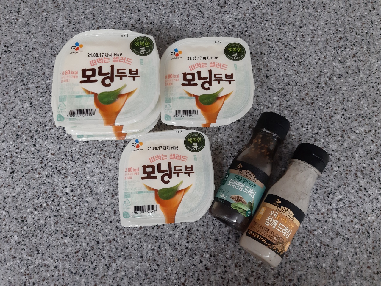 행복한 콩 모닝두부 2팩, CJ 오리엔탈 드레싱 50ml, 햇반 현미밥 1팩, 시금치 2줄기(60g), 로메인 5장, 치커리 6줄기, 적치커리 6줄기, 적양배추 40g, 당근 1/6개, 오이 1/2개, 캔 옥수수 4T, 나쵸칩 50g
