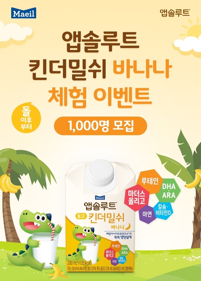 ‘앱솔루트 킨더밀쉬 바나나’를 체험하고 싶은 분은 8월 17일(화)부터 8월 31일(화)까지 매일아이 홈페이지(www.maeili.com) 이벤트 페이지에 접속해 ① 신청하기 버튼을 클릭하고, ② 체험제품 배송 주소를 확인한 뒤, ③ 제품을 체험하고 싶은 이유를 댓글에 남기면 된다. 체험 후기를 작성할 개인 SNS 주소를 남기거나 SNS에 #킨더밀쉬 #앱솔루트킨더밀쉬 #아기간식 #매일유업 #앱솔루트 해시태그와 함께 이벤트를 공유하면 당첨 확률이 올라간다.