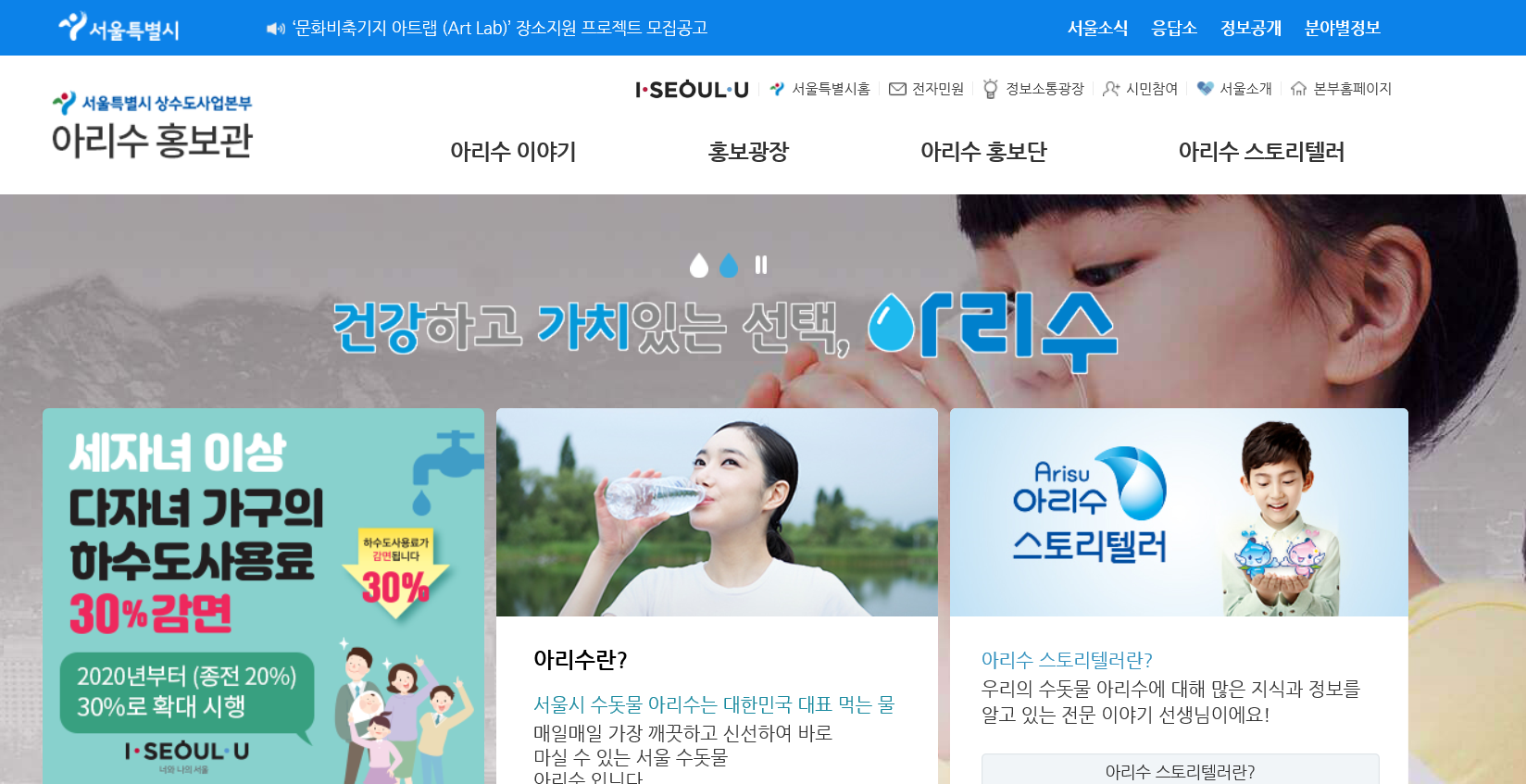 서울의 수도물 '아리수' 뿐 아니라 부산의 수도물 ‘순수365’, 대구의 수도물 ‘달구벌 맑은물’, 인천의 수도물 ‘미추홀 참물’ 등 제각기 예쁜 이름들을 갖고 있었다.